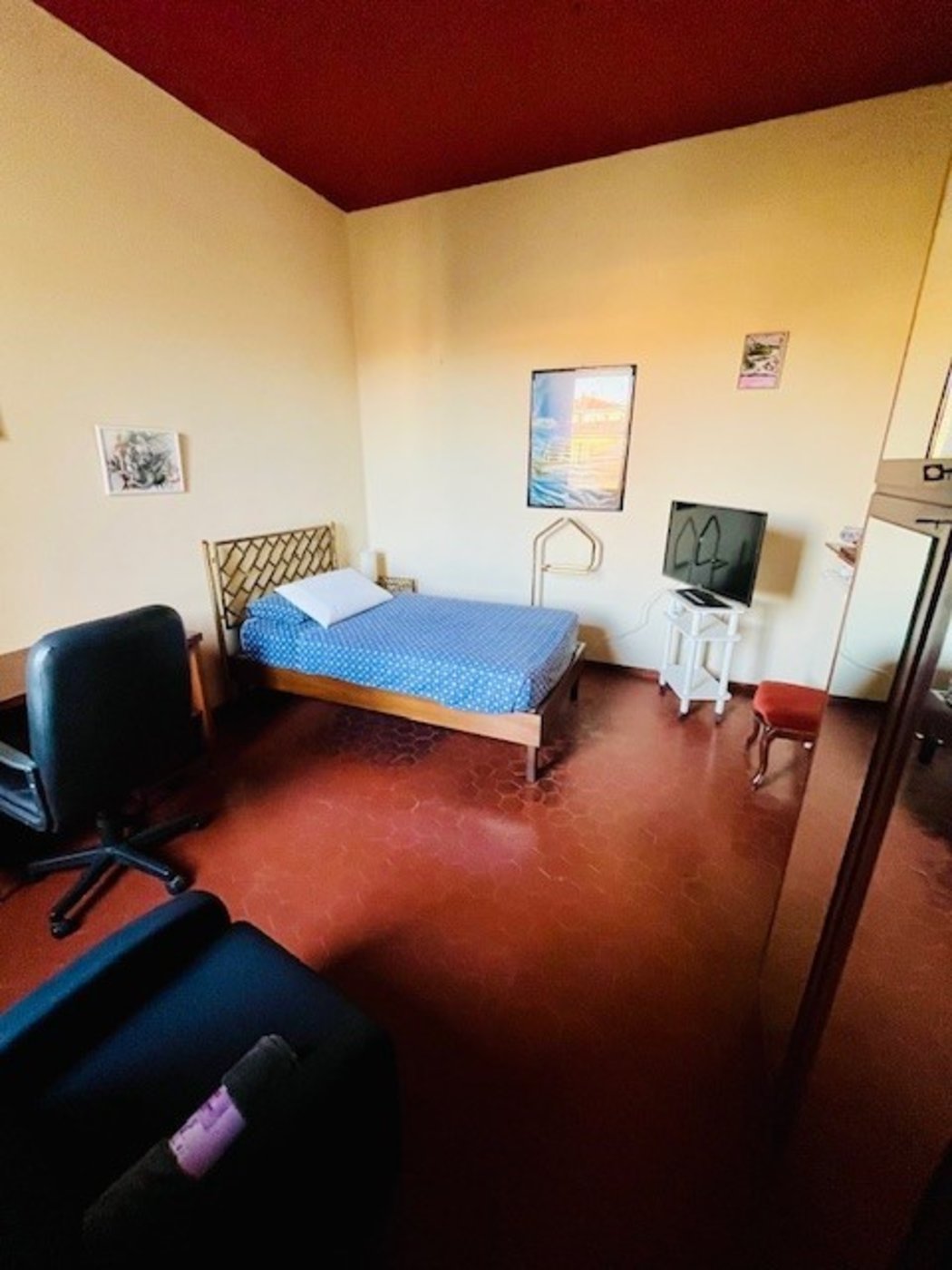 Ampia camera da letto di 18m² con letto di una piazza e mezzo, un grande armadio, scarpiera, poltrona, televisione 38" e scrivania con sedia.